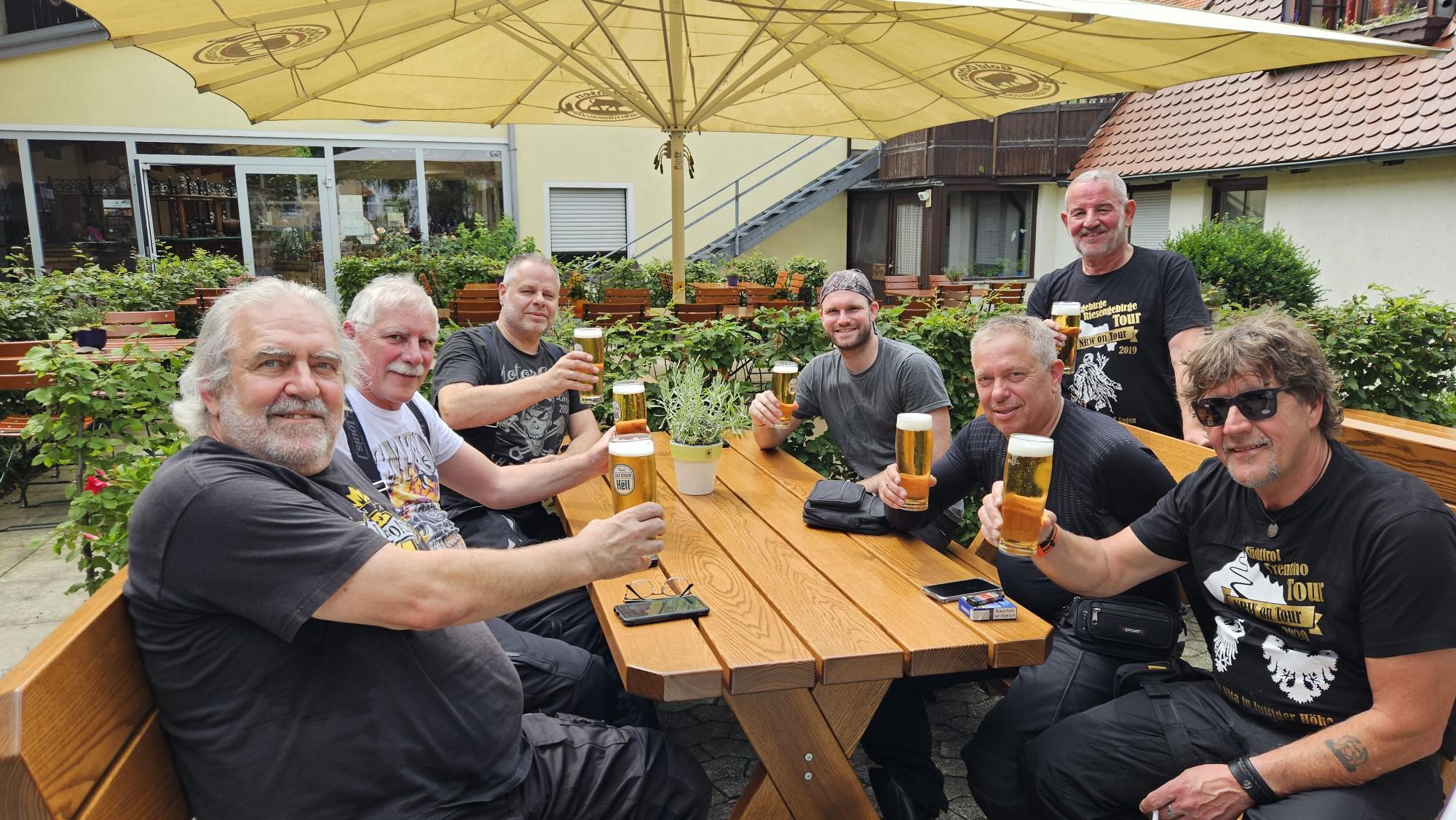 Wir sind an unserem Zwischenziel Hotel Krone auf der schwäbischen Alp angekommen. Und das schon um Punkt 3. Und die kühlen Blonden sind auch schon da. Prost.