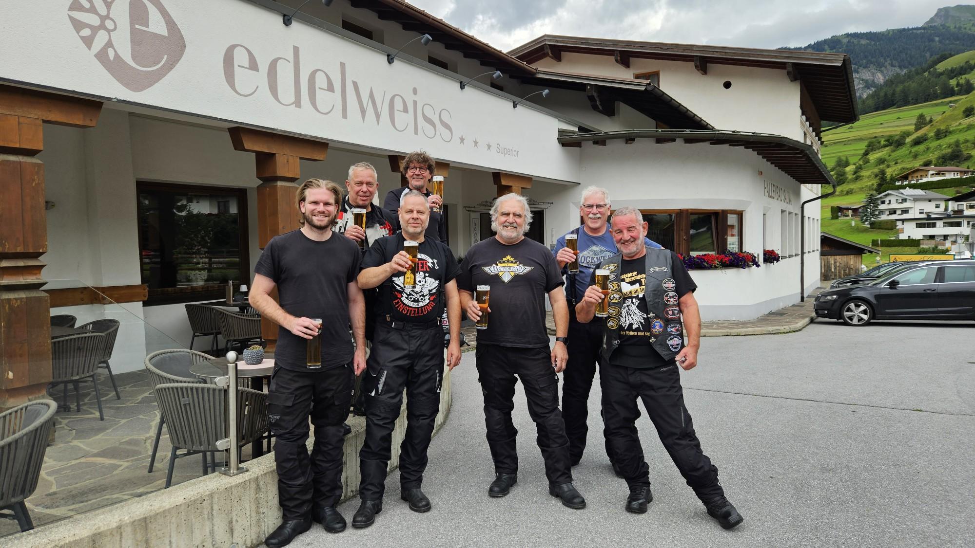 Es ist geschafft, wir sind am Hotel Edelweiß in Nauders angekommen. Es war eine durchnässt Fahrt teils mit 5 Meter Sicht auf den Pässen. Aber jetzt passt alles, und natürlich ewieder ein Bier vor Vier.