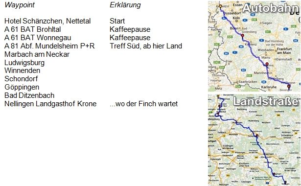 Betrifft nur An- und Abreise. Wenn es der Verkehr erlaubt, werden wir auf der Autobahn eine Reisegeschwindigkeit von etwa 110 km (echten laut Navi) ansetzen. Damit quält keiner sein Moped, der Spritverbrauch liegt im normalen Bereich, und auch ohne Windschild ist die Geschwindigkeit gut zu ertragen. Pinkel- und Raucherpausen machen wir nach max. 1,5 h, bei der Anreise habe ich schon entsprechende Rastplätze in der Tourplanung mit eingebaut.